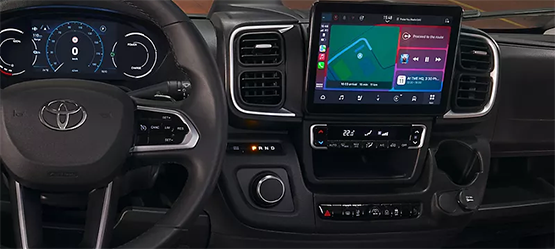 De Proace Max heeft een comforabel interieur met airconditioning, twee of drie zitplaatsen en genoeg ruimte om onderweg ook te kunnen werken of ontspannen. Het Toyota ProTouch Multimedia System vormt het hart van de moderne connectiviteit in je bedrijfsbus, toegankelijk gemaakt door een gebruiksvriendelijk 10" touchscreen.