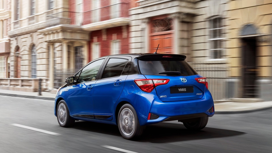 Toyota-Yaris-Hybrid-driekwart-achteraanzicht-rijdend-stad
